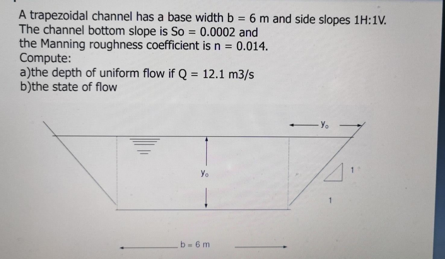 Solved A Trapezoidal Channel Has A Base Width B 6 M And Chegg Com